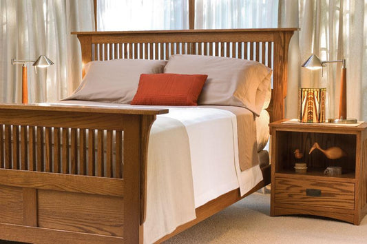 When you're searching for a new bedroom set, consider Prairie Mission bedroom furniture. Our Prairie Mission collection is inspired by the American Craftsman style from the early 20th century. That means we achieve authentic mission styling that compliments any bedroom with its straight lines, right angles, and clean cuts. The deeply colored stains and exposed wood grain makes for timeless pieces. A Prairie Mission bed frame will endure all kinds of abuse while maintaining endless beauty.