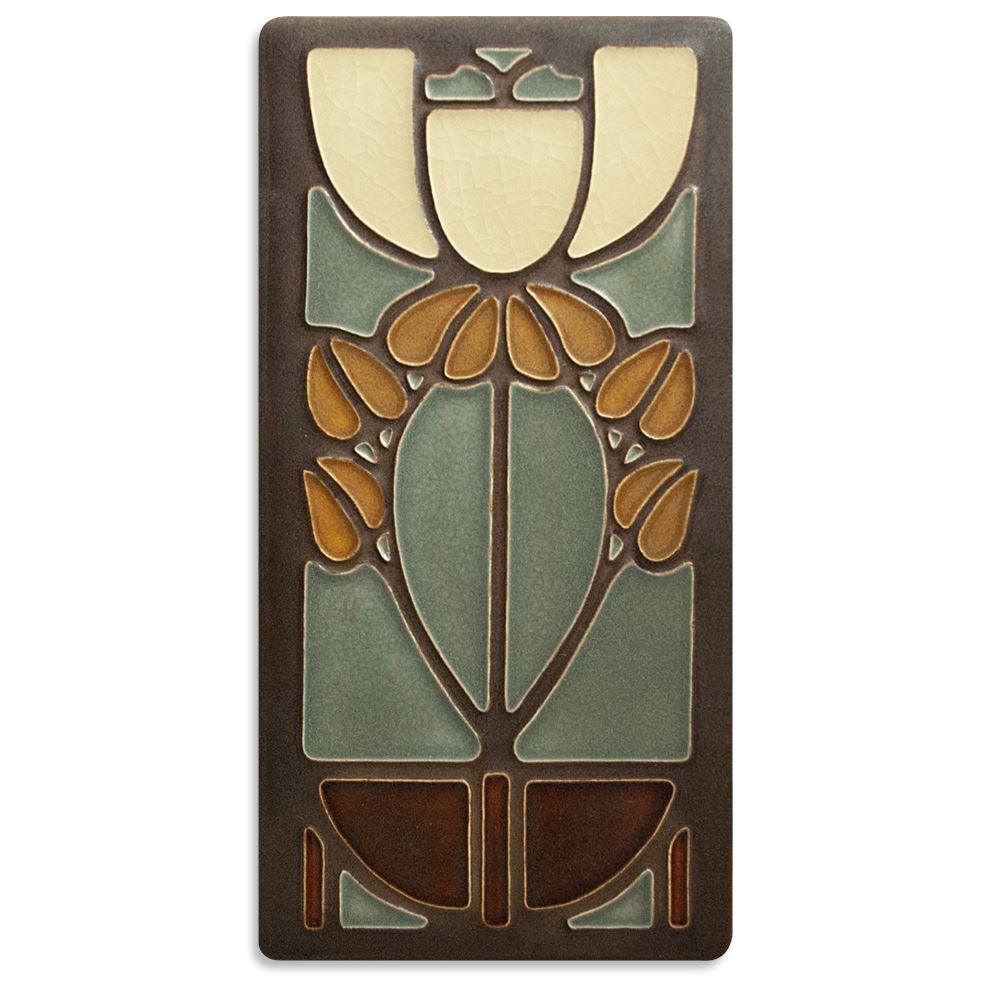 This tile was adapted from an art glass window that Dard Hunter designed for the Roycroft Inn in 1906.