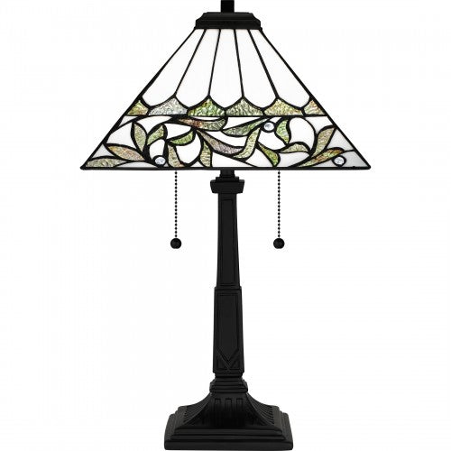The Galahad Table Lamp features a unique blend of floral and geometric design, creating a stunning visual display. Made with iridescent glass, this lamp adds a touch of elegance to any room, transforming it into a sophisticated space.